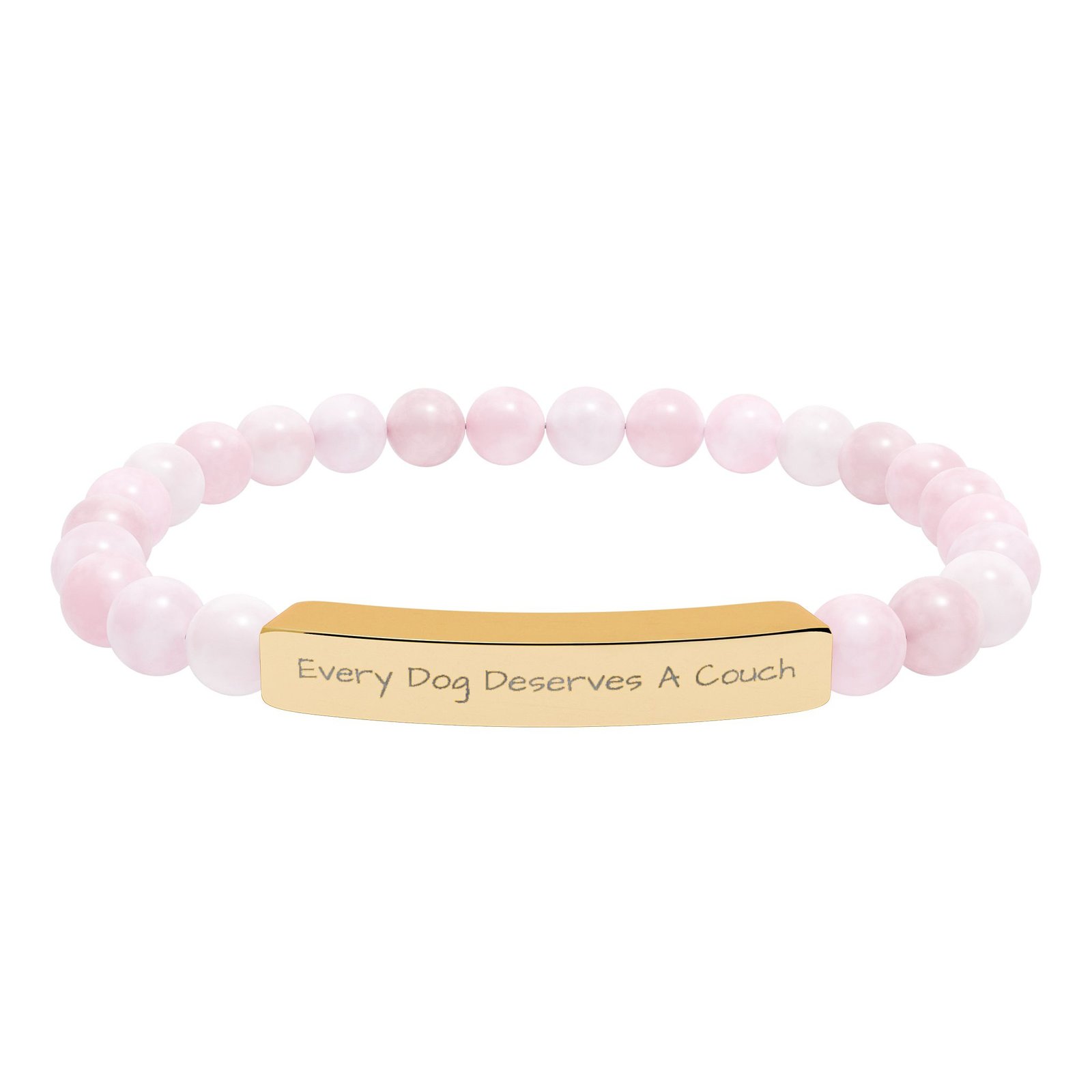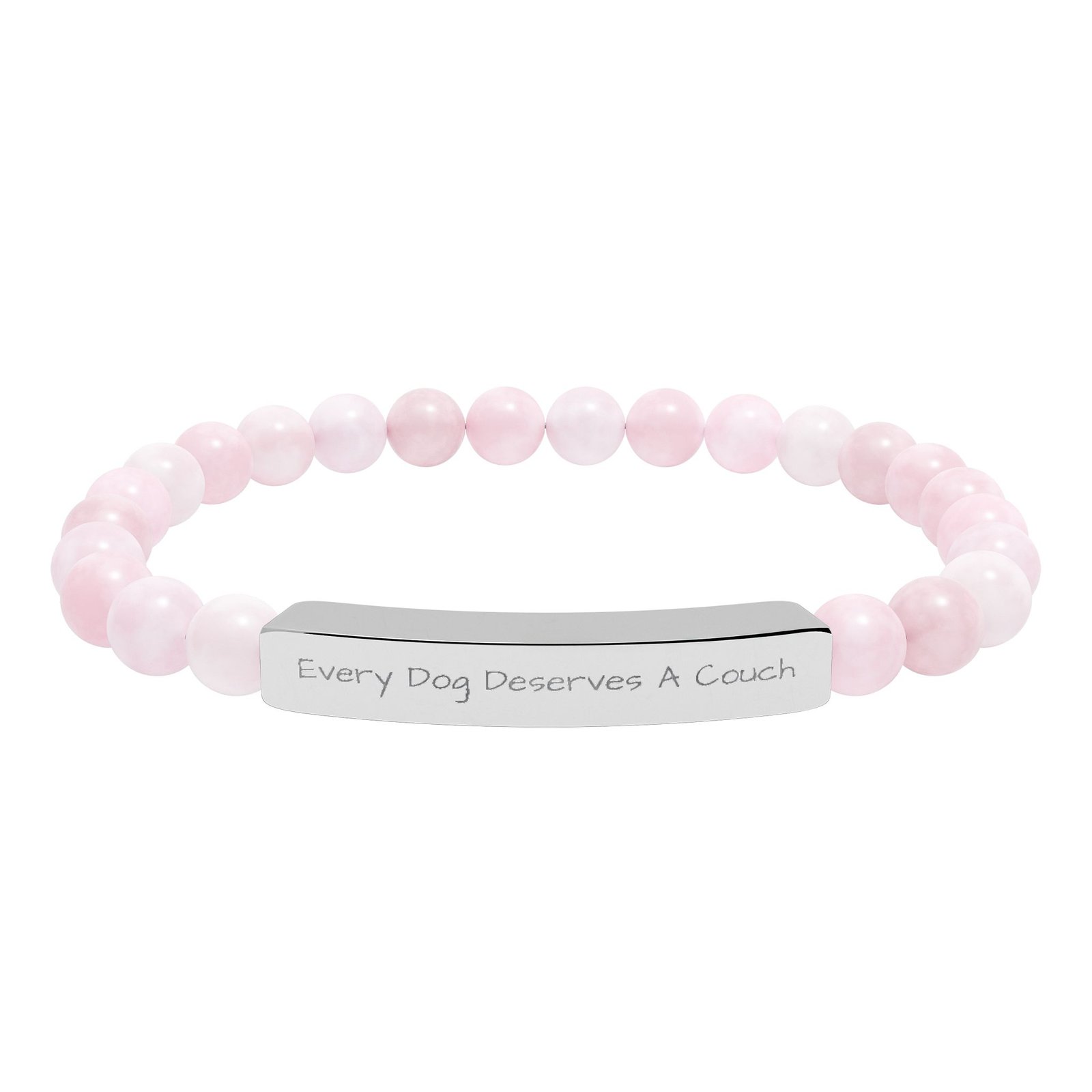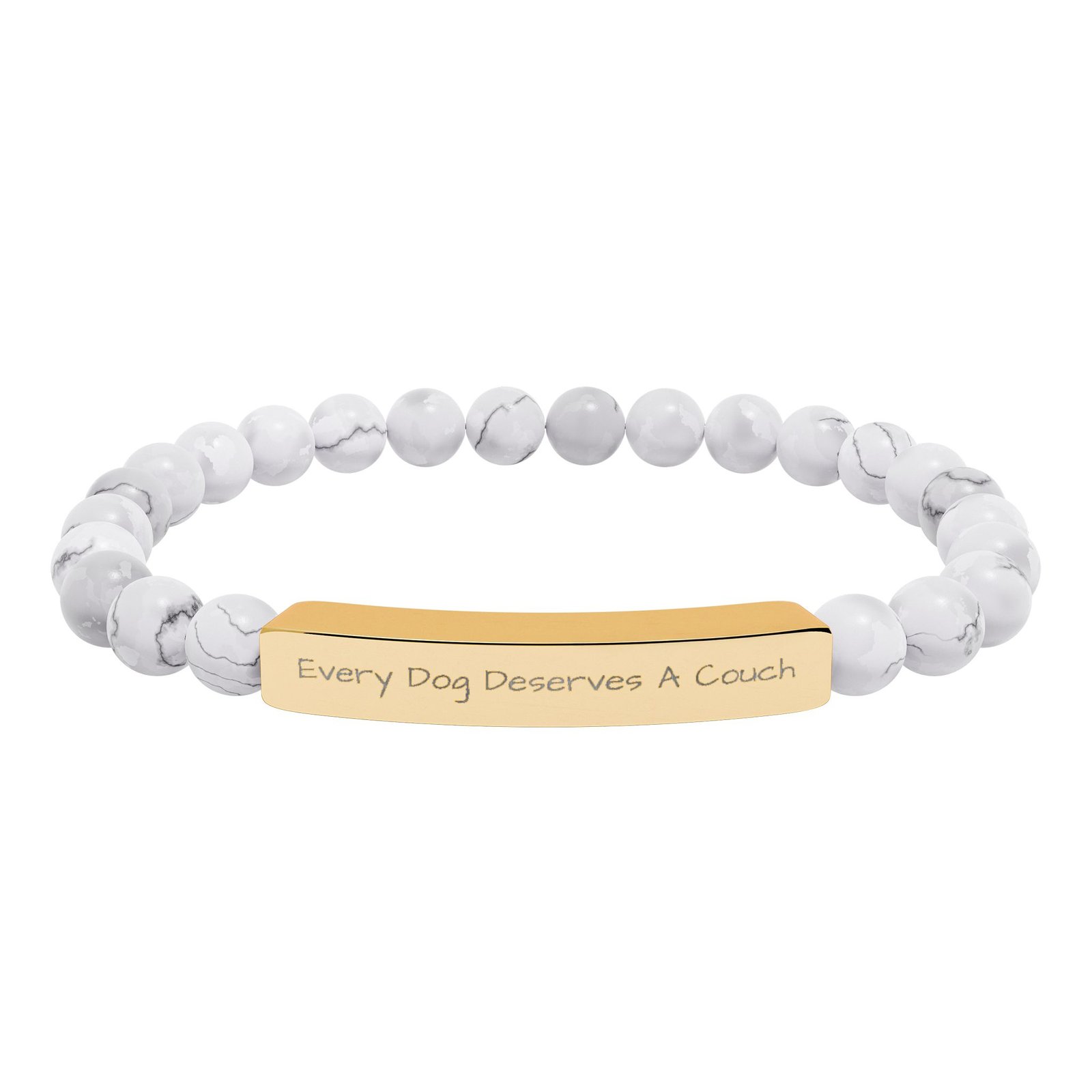 This genuine semi-precious stone bracelet features our powerful message engraved on stainless steel: “Every Dog Deserves A Couch.”