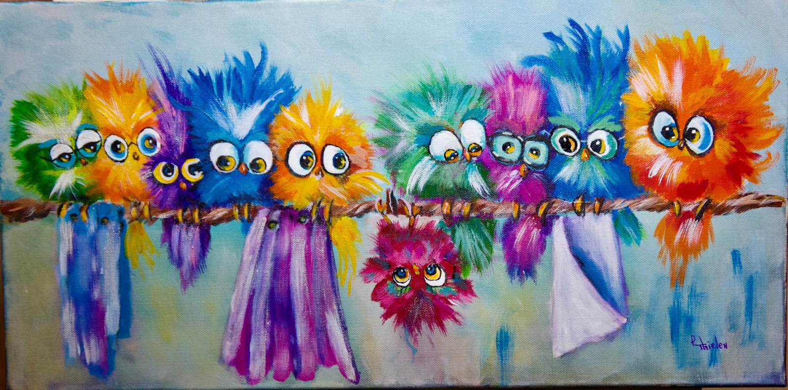 Original Acrylic Painting – Vibrant Birds on Laundry Line