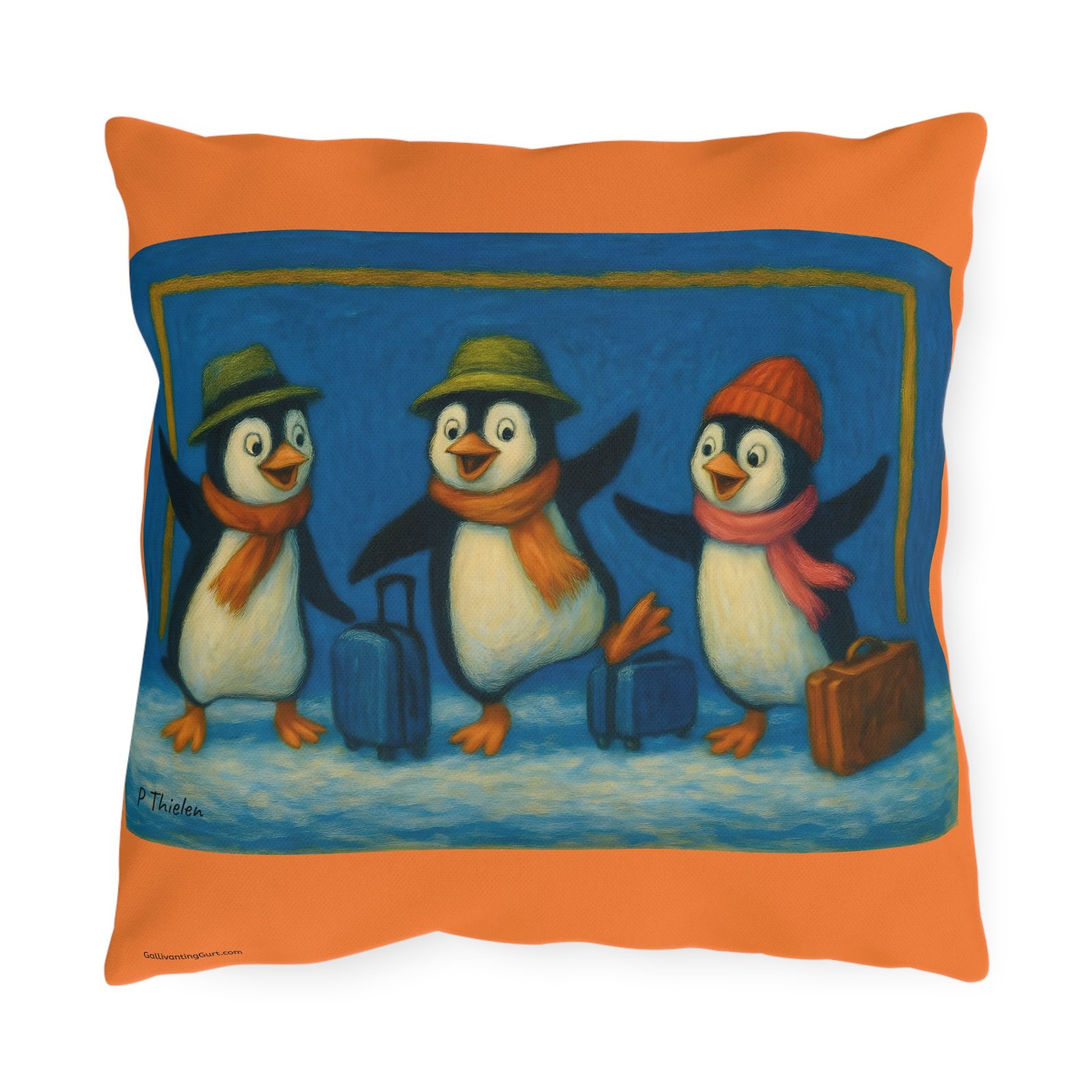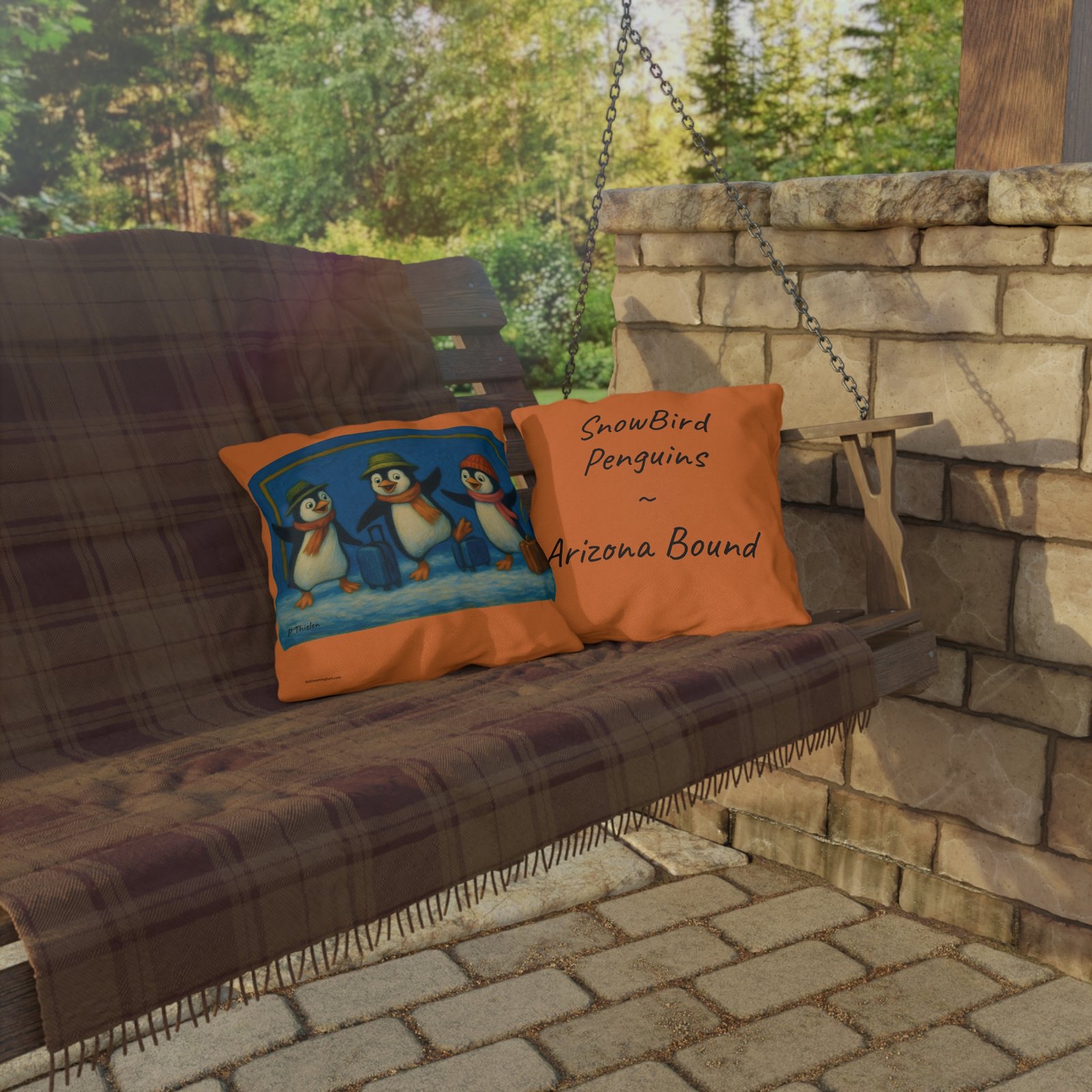 Bright, cheerful outdoor pillows that bring a playful, travel-ready energy to your patio, porch, or sunroom. The front showcases three hand-painted penguins dressed for a trip—scarves, hats, and suitcases—framed by a rich blue border and set against a warm orange background. The reverse side features whimsical hand-lettering that reads “SnowBird Penguins ~ Arizona Bound,” adding personality when cushions are flipped during different seasons. These pillows hold their shape, resist fading from sun and water, and print double-sided with vivid, crisp color. They slip easily into both casual outdoor seating and cozy indoor nooks, creating an inviting spot that sparks smiles and conversation.