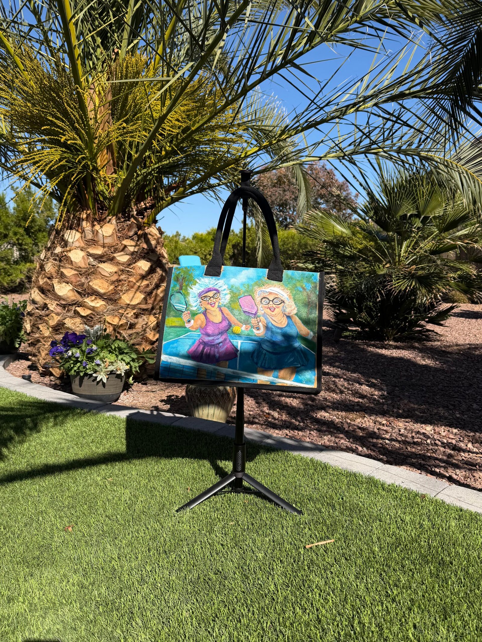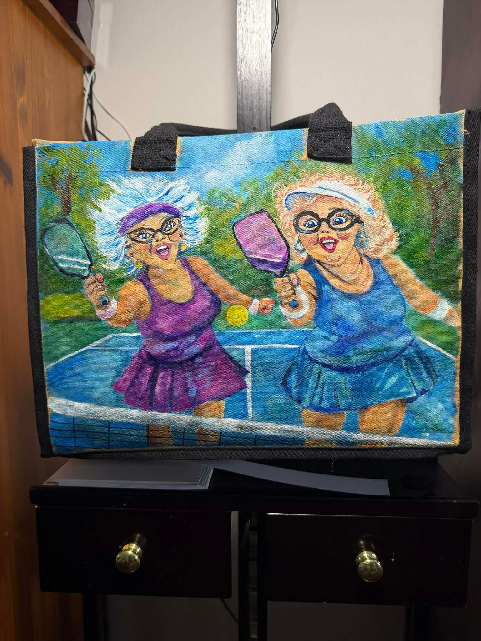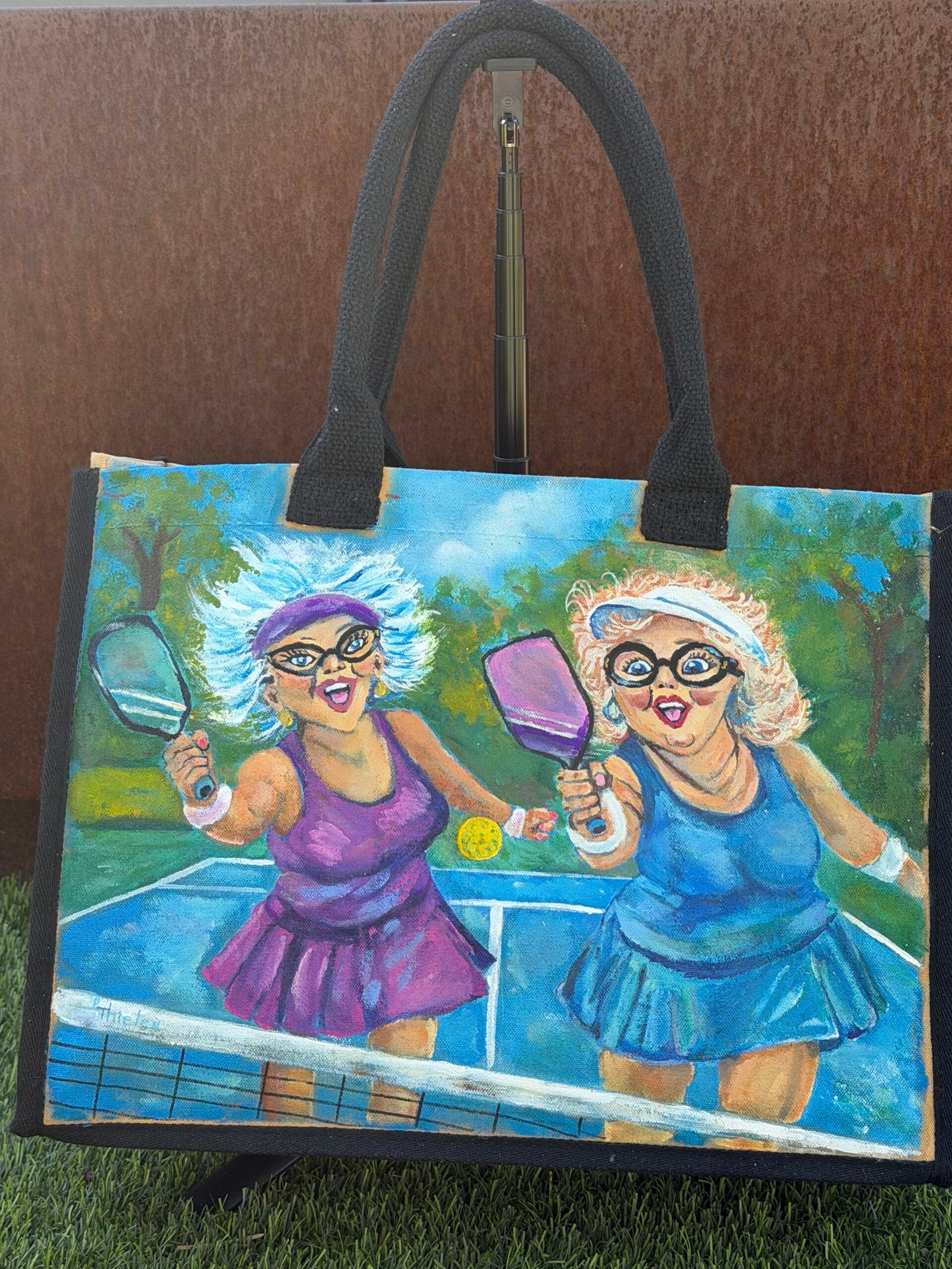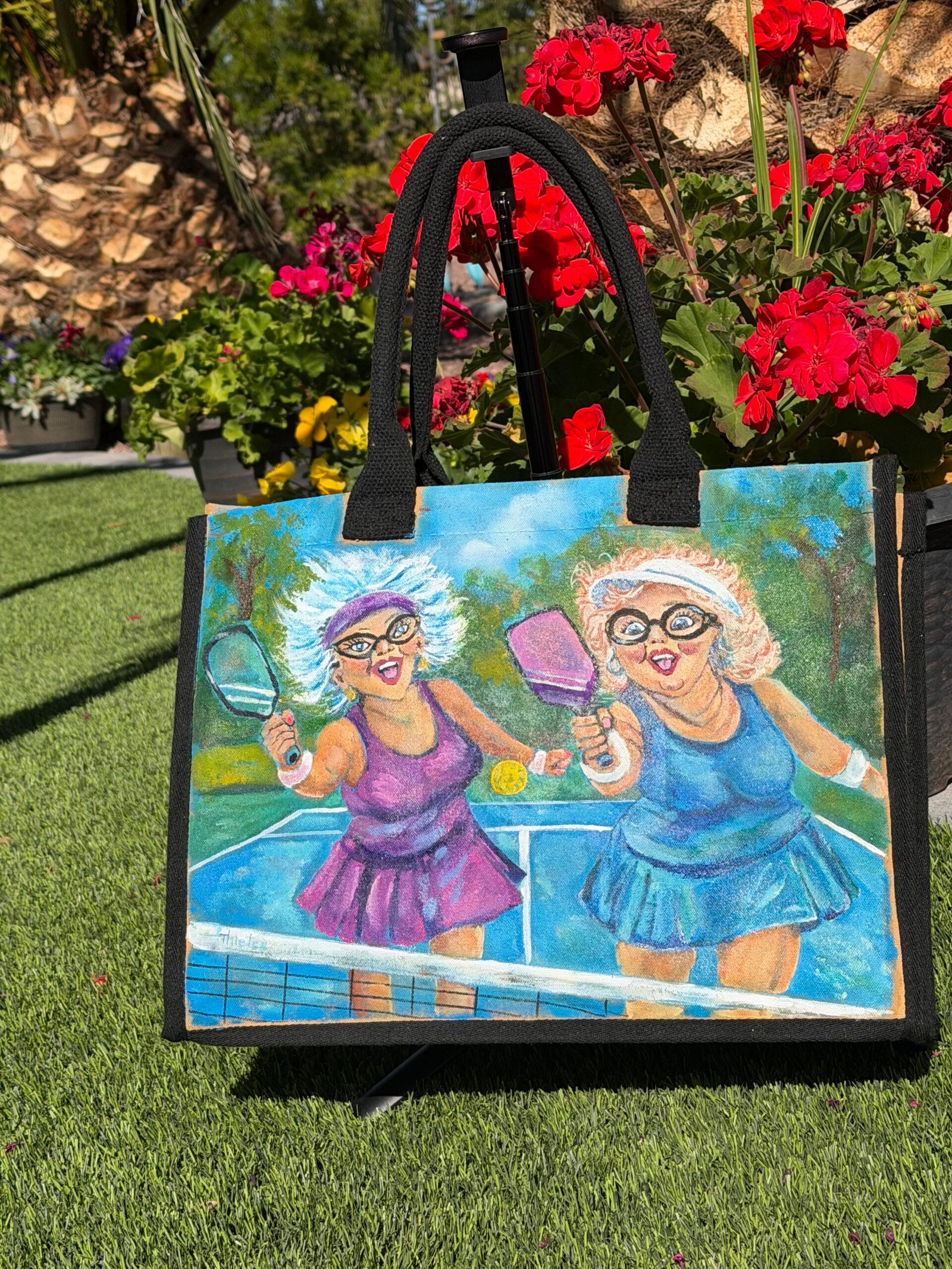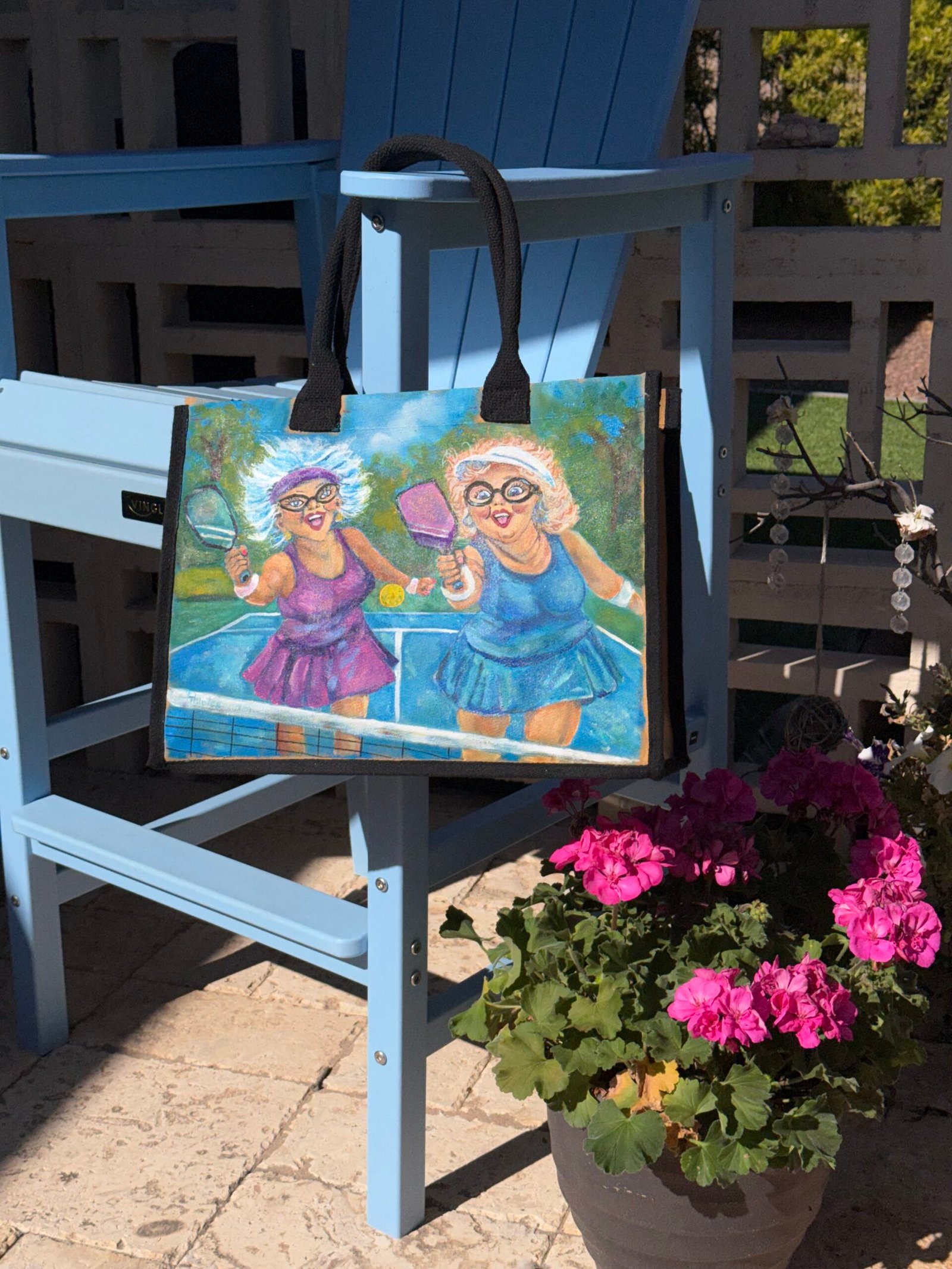 One-of-a-kind hand-painted canvas tote featuring two pickleball besties living their best lives on the court.