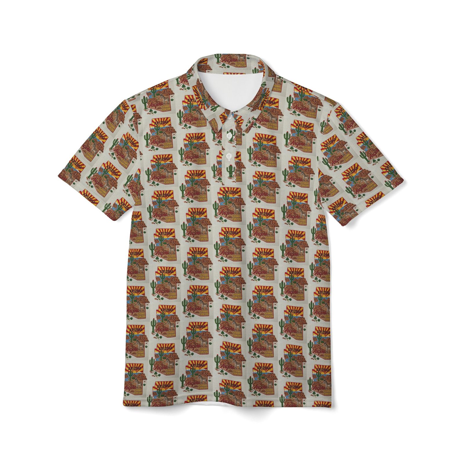 Polo shirt featuring a Vintage Arizona Souvenir print look of hand-embroidered souvenir map of Arizona with state outline, Saguaro Cactus, Grand Canyon, and burros print. Gives off a retro and adventurous vibe, perfect for those who love travel and exploring. Ideal for Arizona residents or visitors, great for holidays like National Arizona Day or Grand Canyon National Park Week.